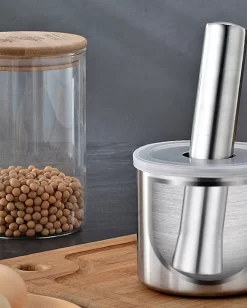 2er Set BAYLI Edelstahl Mörser Mit Stößel & Deckel – Massiver Gewürzmörser Für Die Küche – Bruchfeste Kräutermühle – Gewürzmühle Für Kräuter Und Gewürze – Tabletten Zerkleiner – Tablettenmörser