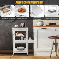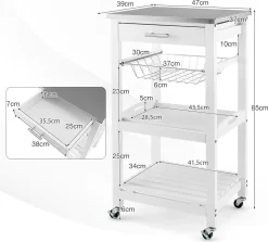 COSTWAY Kleiner Küchenwagen, Servierwagen Auf Rollen, Arbeitsplatte Aus Edelstahl, Schublade, Korb & Abnehmbarem Serviertablett, Rollwagen Kücheninsel, Küchentrolley Landhausstil Weiß, 47x39x85cm
