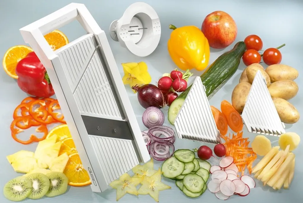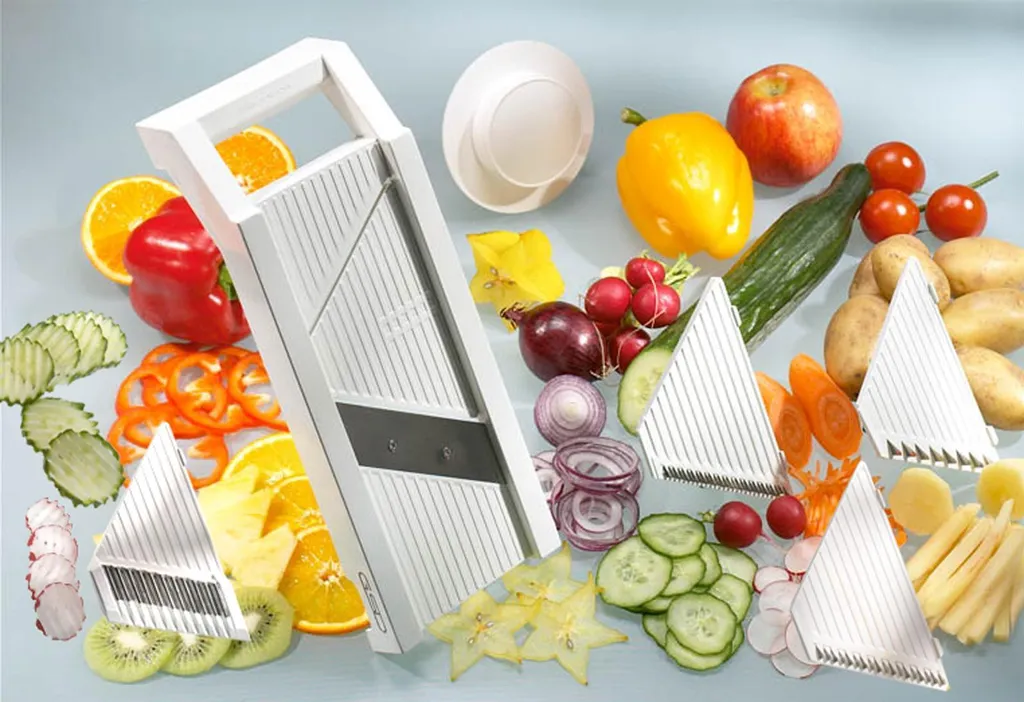 GSD 30 000 Universal-Gemüsehobel Aus Kunststoff, Mit 3 Einsätzen Aus Edelstahl, Silber