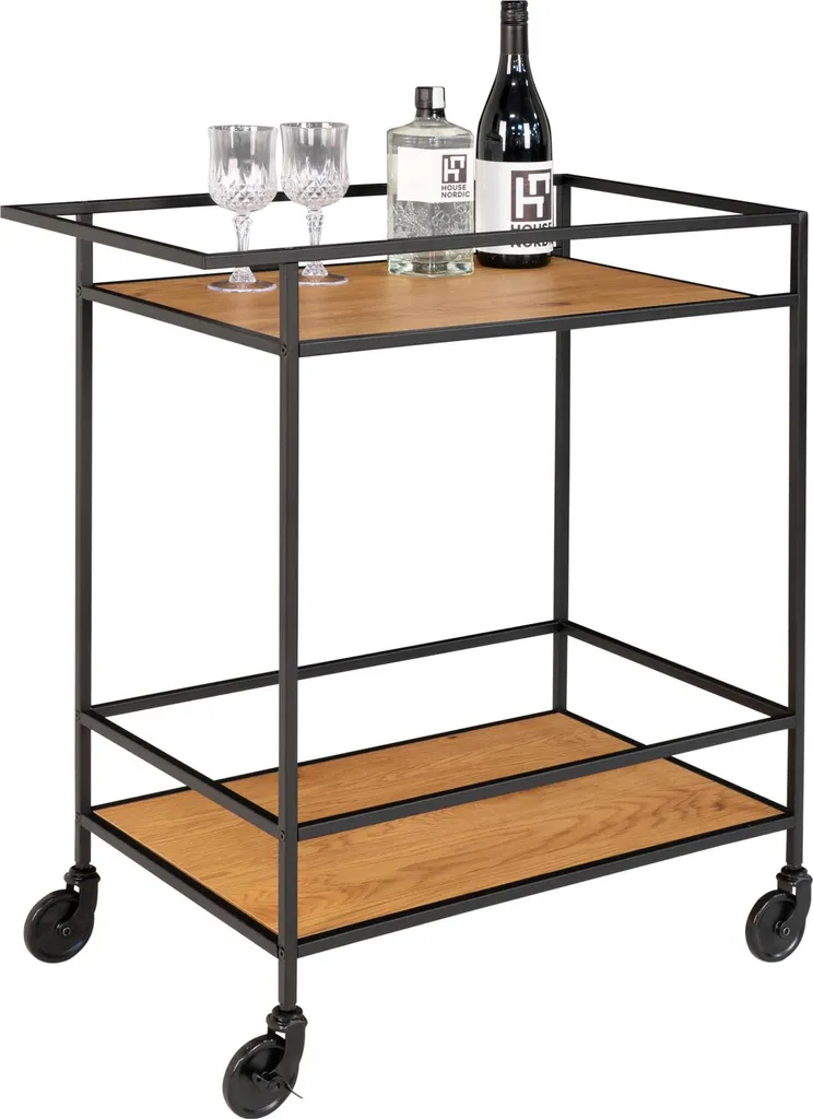 Moderner Bar-Rollwagen Barwagen LEVEN Schwarz + Eiche-Look Regalböden