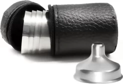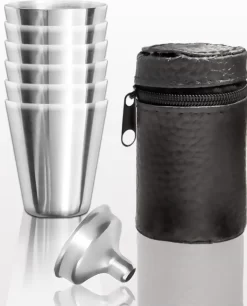 Outdoor Saxx® – 8-Teiliges Edelstahl-Becher Set, 6 Unzerbrechliche Schnaps-Becher, Schnaps-Gläser Aus Metall, Metall-Becher Mit Einfüll-Trichter Und Leder-Tasche, Ideales Flachmann-Zubehör