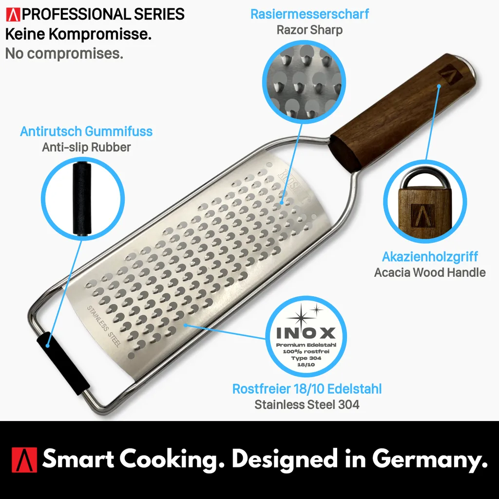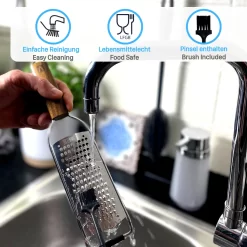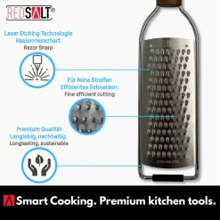 REDSALT® Premium Parmesanreibe Mit Holzgriff | Rasiermesserscharfe Profi Julienne Edelstahl Reibe Für Feine Gemüsestreifen Karotte Zucchini Kartoffel Obst Apfel | Küchenreibe Hobel Raspel Für Käse