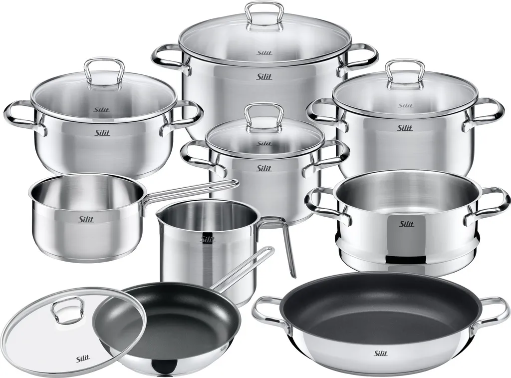 Silit Toskana Topfset Induktion 10-teilig, Kochtopf Set Mit Glasdeckel, Milchtopf, Dämpfer, Pfanne, Edelstahl Teilmattiert, Töpfe Set Unbeschichtet